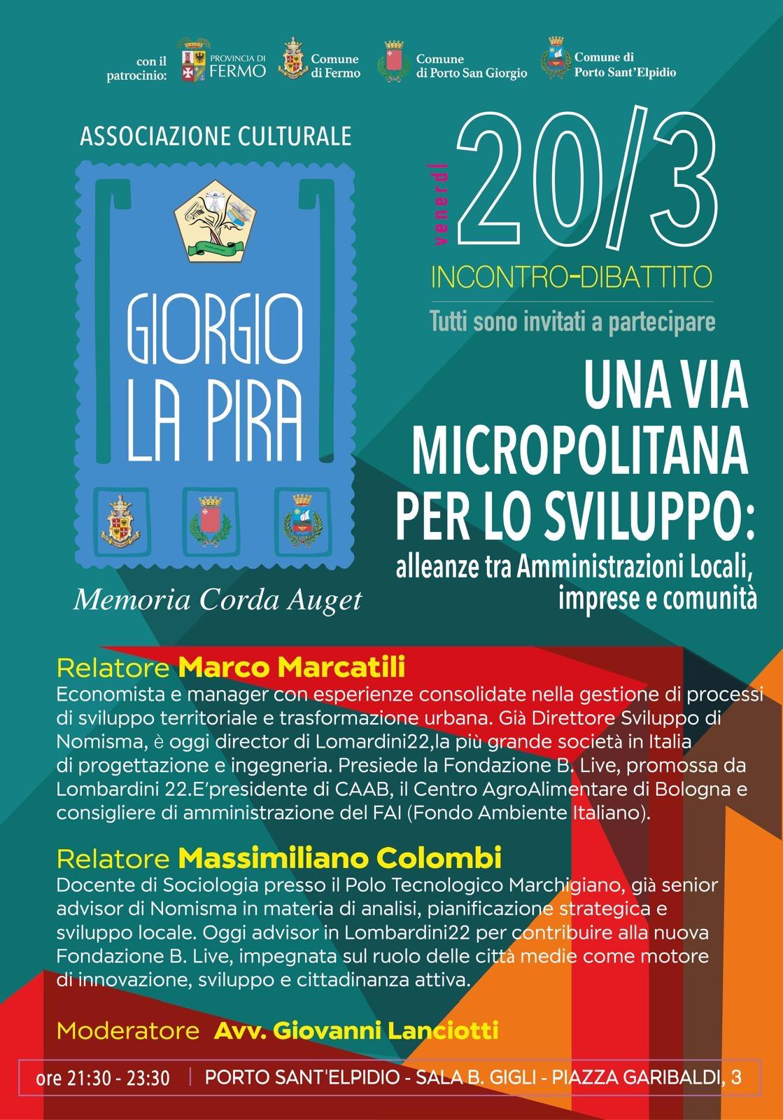 Il futuro delle Marche passa anche attraverso le alleanze tra enti pubblici. È questo il cuore dell’incontro-dibattito dal titolo “Una via micropolitana per lo sviluppo: alleanze tra Amministrazioni Locali, imprese e comunità”, che si terrà venerdì 20 marzo presso la Sala B. Gigli di Porto Sant’Elpidio. L’incontro è aperto a tutta la cittadinanza, agli amministratori locali e agli imprenditori del territorio.