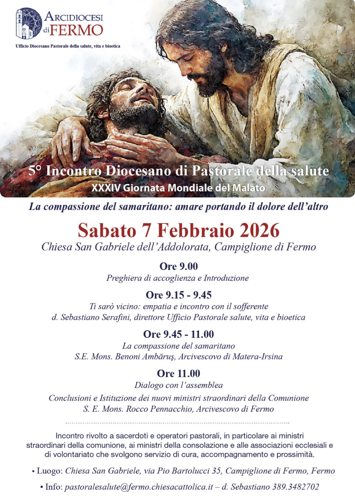 Sabato 7 febbraio 2026, dalle ore 09.00, presso la Chiesa San Gabriele dell’Addolorata a Campiglione di Fermo, si terrà il 5° Incontro diocesano di Pastorale della Salute.