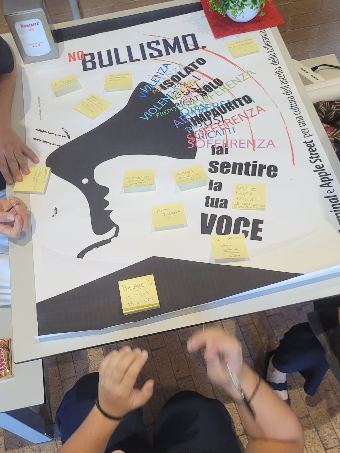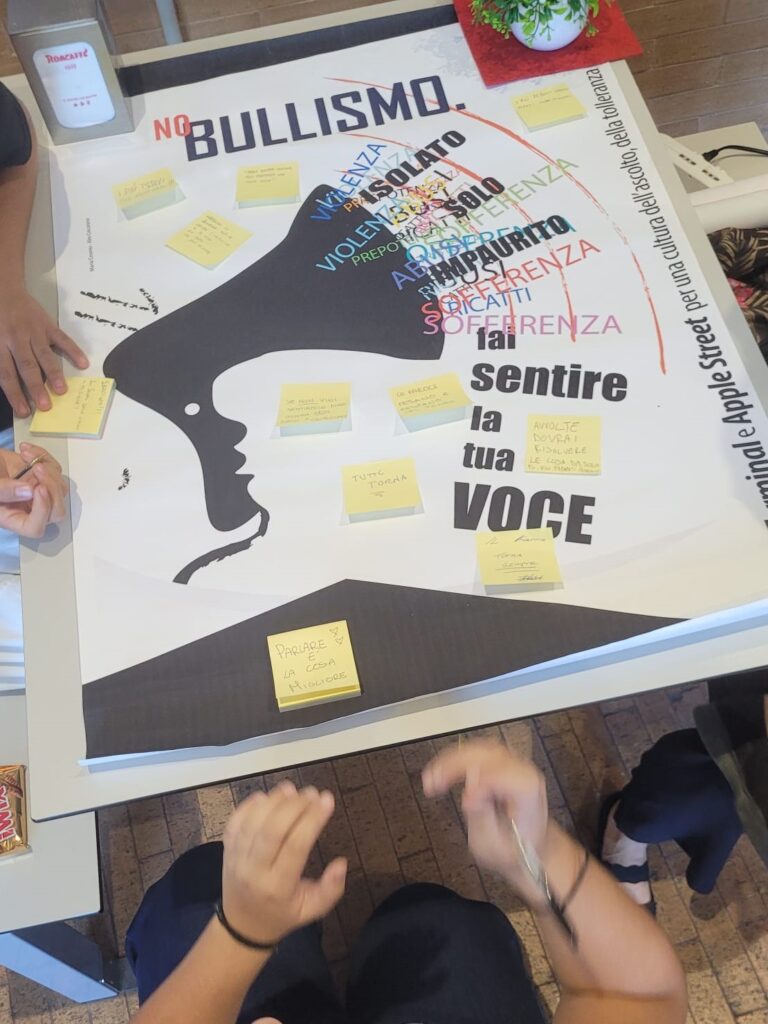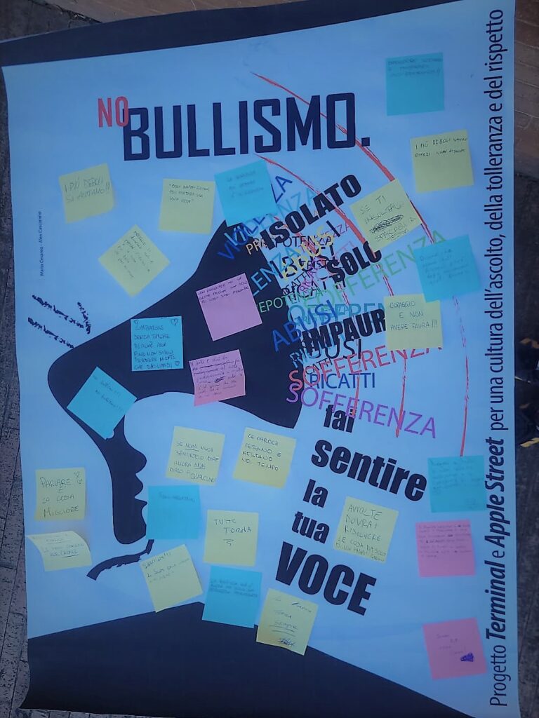 Durante gli incontri, i ragazzi hanno condiviso con gli educatori e tra loro esperienze personali o vissute da amici, legate a episodi di bullismo motivati da differenze fisiche, di genere, di orientamento sessuale, di origine etnica o da situazioni di disabilità. Al termine della riflessione, ciascuno studente ha ricevuto un foglietto adesivo e una penna: un gesto simbolico ma denso di significato. Su quei piccoli biglietti, i ragazzi hanno scritto un pensiero, un messaggio o un impegno personale contro il bullismo. Ifoglietti sono poi stati affissi liberamente sul materiale predisposto per l’occasione. Il collage finale di messaggi ha dato forma e forza all’impegno collettivo degli studenti diventando un vero manifesto di solidarietà, rispetto e consapevolezza. Tra le frasi emerse troviamo: “Restituisci a parole, le mani servono per creare.” – “Parlare è la cosa migliore.” – “Le parole pesano e restano nel tempo.” – “I più deboli si aiutano!” – “Coraggio, non avere paura!”