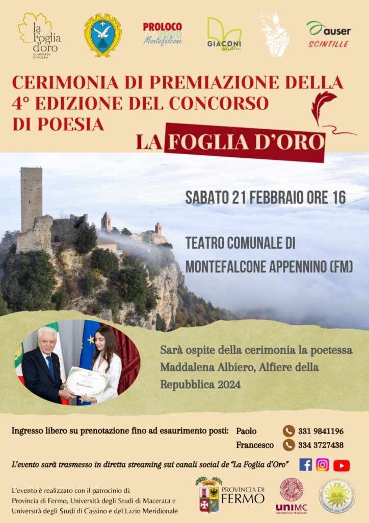 Ci siamo: svelati i nomi dei finalisti della quarta edizione del concorso di poesia “La Foglia d’oro”. Il concorso è organizzato dalla neonata associazione “La Foglia d’oro Aps”, dalla Proloco e dal Comune di Montefalcone Appennino in collaborazione con Giaconi editore. L’evento è patrocinato dalla Provincia di Fermo, dall’Università degli studi di Macerata e dall’Università di Cassino e del Lazio Meridionale.