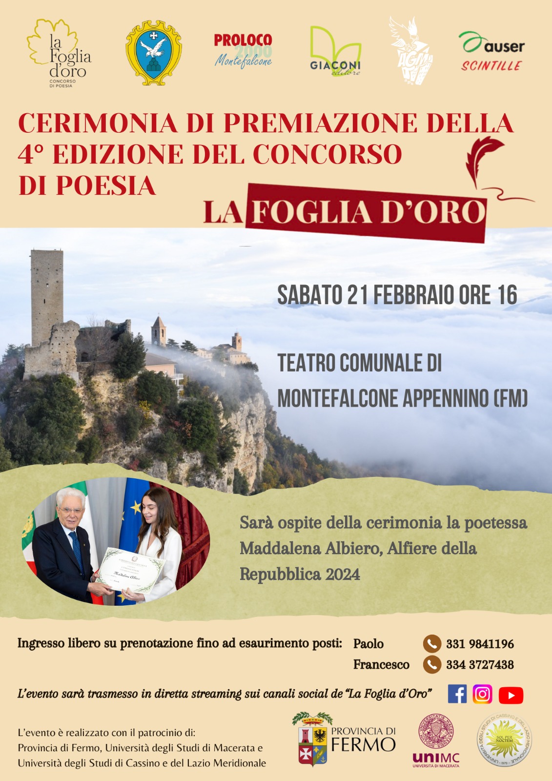 Sono 200 in tutto componimenti arrivati per le due sezioni in concorso (singoli e Scuole primaria e secondaria di primo grado) con partecipanti da tutta Italia. La cerimonia di premiazione si terrà al teatro comunale di Montefalcone Appennino sabato 21 febbraio alle ore 16 (ingresso gratuito su prenotazione. La cerimonia sarà anche trasmessa live sui principali canali social). Nel corso della cerimonia verranno proclamati vincitori, secondi, terzi posti delle due sezioni in concorso. Ospite d’onore della serata la giovane Maddalena Albiero (da Bardolino, in provincia di Verona, classe 2007), poetessa insignita a maggio scorso dal presidente Sergio Mattarella del prestigioso titolo di Alfiere della Repubblica proprio per la sua attività letteraria. Autrice di “Occhi che parlano” (ed. Planet Book, 2023), Maddalena racconta attraverso la poesia le speranze, i sogni e le paure degli adolescenti di oggi.
