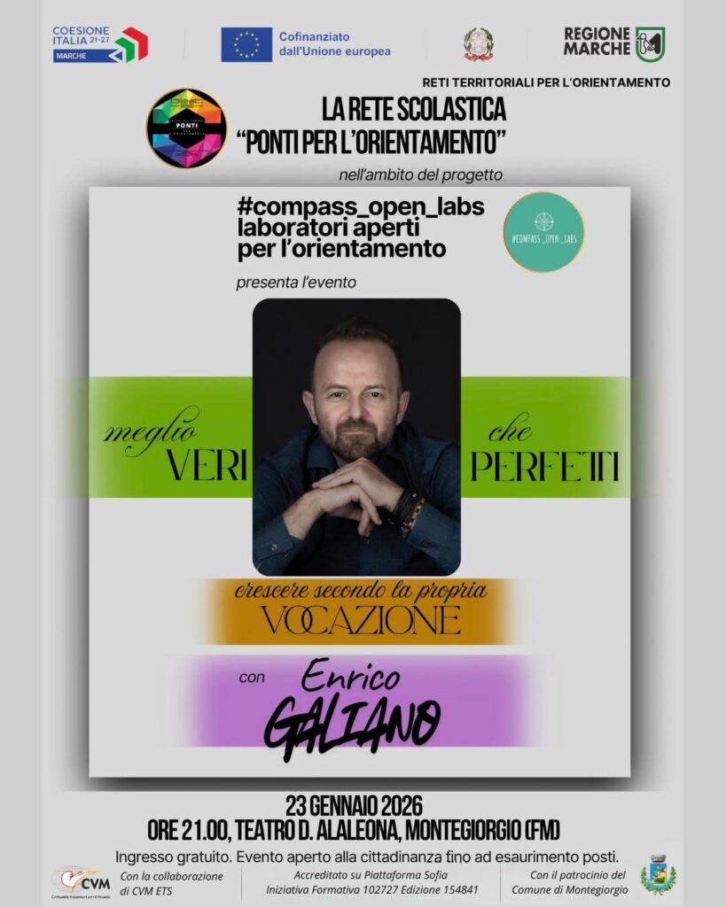 Il progetto culminerà il 23 e 24 gennaio con un ospite d’eccezione: il prof. Enrico Galiano. Presso lo storico Teatro “Alaleona”, lo scrittore e docente terrà l’incontro “Meglio veri che perfetti”. Un messaggio potente rivolto a studenti, genitori e docenti sull’importanza di seguire la propria vocazione autentica, lontano dalla pressione sociale della perfezione. Grazie alla gestione logistica della Rete Territoriale, che garantisce i trasporti tra le varie sedi, il progetto dimostra come la sinergia tra istituzioni possa frenare la dispersione scolastica e valorizzare i talenti locali. Con la sua adesione il Polo Urbani ribadisce la sua missione centrale: essere il ponte che accompagna ogni studente oltre l’aula, valorizzando il talento individuale come risorsa preziosa per l’intera comunità.