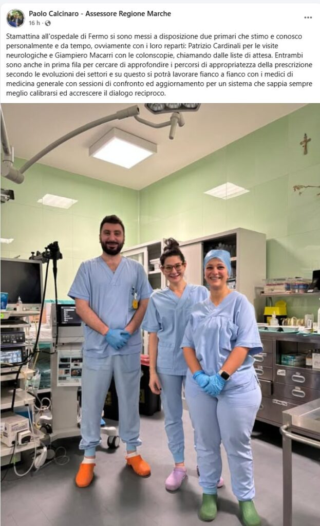 «All’ospedale di Fermo (ieri, ndr) si sono messi a disposizione due primari che stimo e conosco personalmente e da tempo, ovviamente con i loro reparti: Patrizio Cardinali per le visite neurologiche e Giampiero Macarri con le colonscopie, chiamando dalle liste di attesa». E’ quanto scritto ieri dall’assessore regionale alla Sanità, Paolo Calcinaro. Il riferimento è ovviamente alle prestazioni sanitarie domenicali, volute e lanciate dallo stesso Calcinaro.