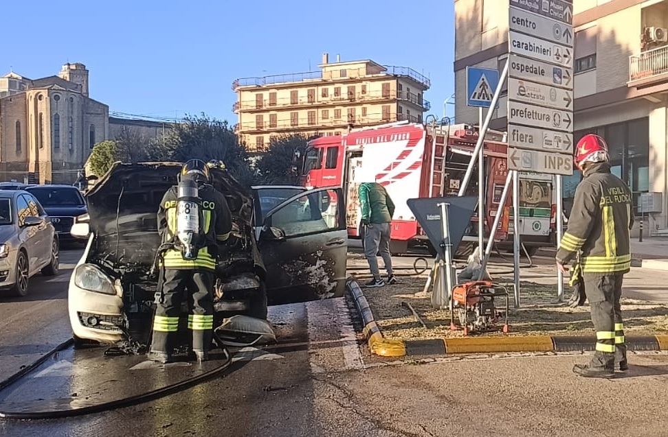 Al 115, infatti, è arrivata una richiesta di intervento per un’auto in fiamme all’altezza della rotatoria all’incrocio con via Zeppilli e via Vecchi. Fortunatamente non si registrano feriti o intossicati.