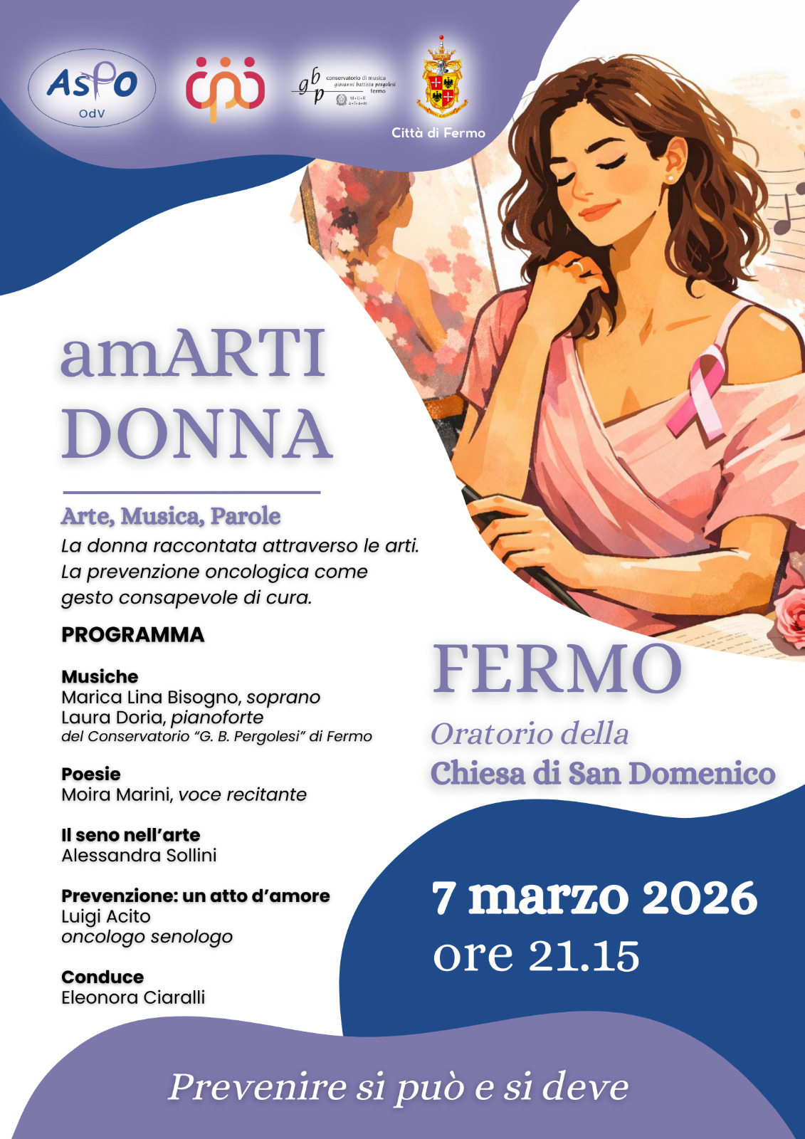 In occasione della Settimana della Donna, la città di Fermo si fa promotrice di un messaggio fondamentale: la prevenzione come atto d’amore e cura consapevole. Sabato 7 marzo 2026, alle ore 21.15, la cornice suggestiva dell’Oratorio della Chiesa di San Domenico di Fermo ospiterà l’evento “amARTI DONNA – Arte, Musica, Parole”.
