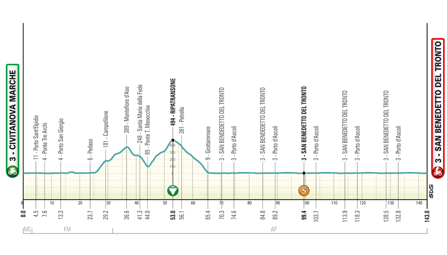 Tappa poco mossa nella prima parte e assolutamente piatta negli ultimi 80 km. Partenza lungo l’Adriatico per entrare lungo la Valle dell’Aso da Pedaso e salire a Montefiore d’Aso. Dopo una breve discesa si raggiunge con l’ultima facile salita Ripatransone. Lunga discesa fino a Grottammare prima di entrare nel circuito di circa 15 km da ripetere 5 volte. Percorso del circuito prevalentemente su strade rettilinee e larghe.