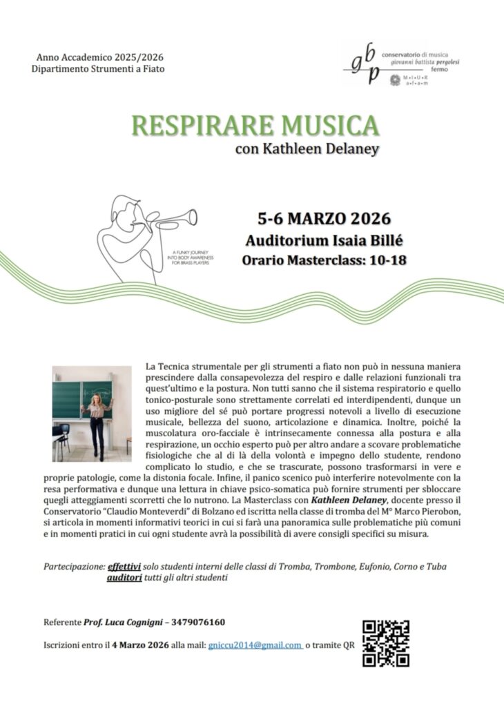 Giovedì 5 marzo e venerdì 6 marzo, alle ore 10, nell’autorevole cornice dell’Auditorium “Isaia Billé”, il Conservatorio “G. B. Pergolesi” di Fermo organizza un appuntamento formativo di alto profilo, dedicato interamente all’approfondimento delle tecniche respiratorie: la masterclass “Respirare Musica” della prof.ssa Kathleen Delaney.