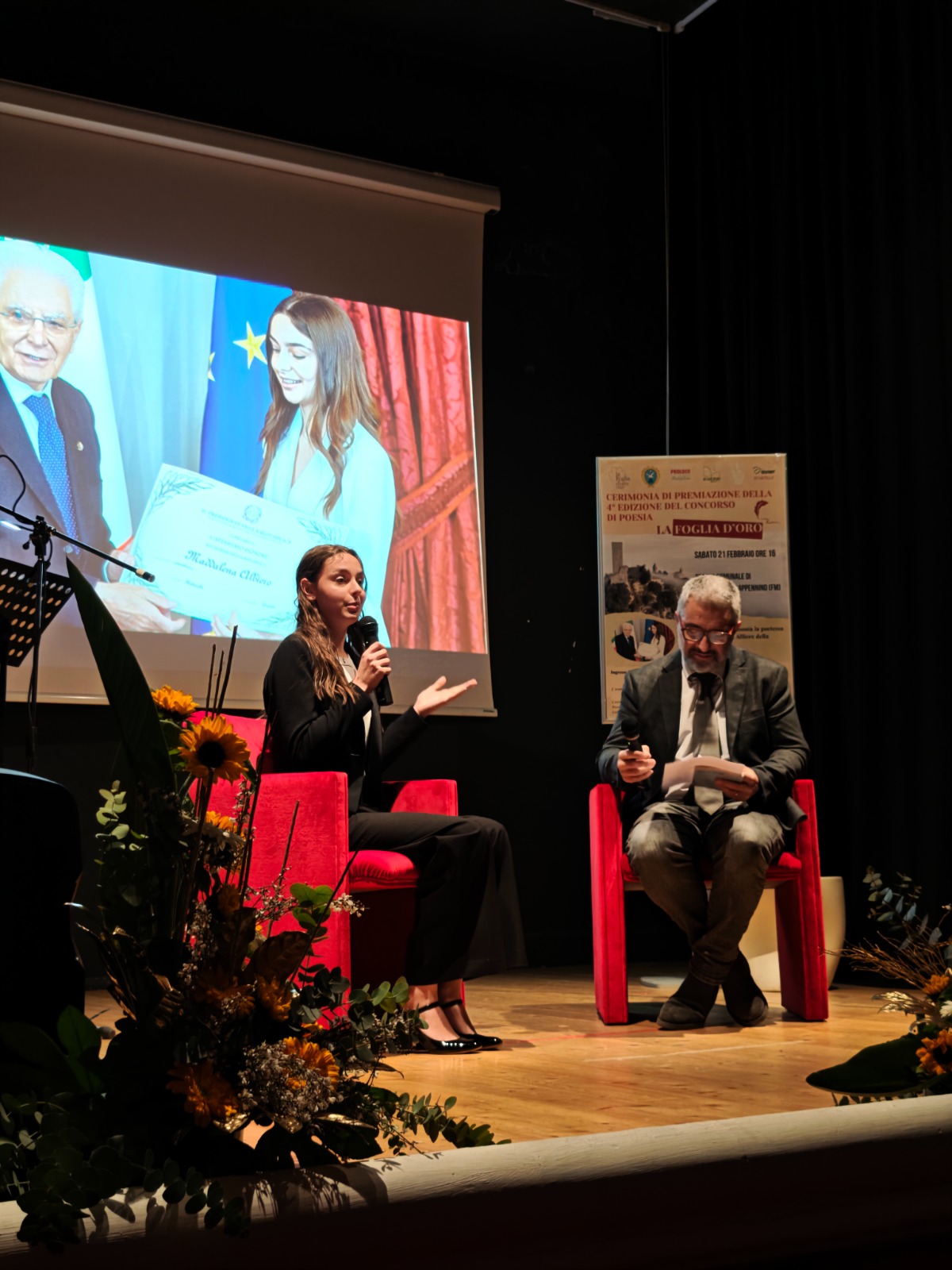Il professor Frenguelli ha intervistato l’ospite della serata, la diciannovenne di Bardolino (Verona) MaddalenaAlbiero, Alfiere della Repubblica 2024 e autrice del libro di versi “Occhi che parlano” con un’attività di poetessa che si rivolge soprattutto alla sua generazione. Tramite i social Maddalena ha raccontato di aver avuto un riscontro positivo da parte di tanti coetanei, incuriositi e attirati dalla poesia, riconoscendo il ruolo importante svolto dalla sua famiglia nell’avvicinarla fin da piccola all’arte e alla cultura.