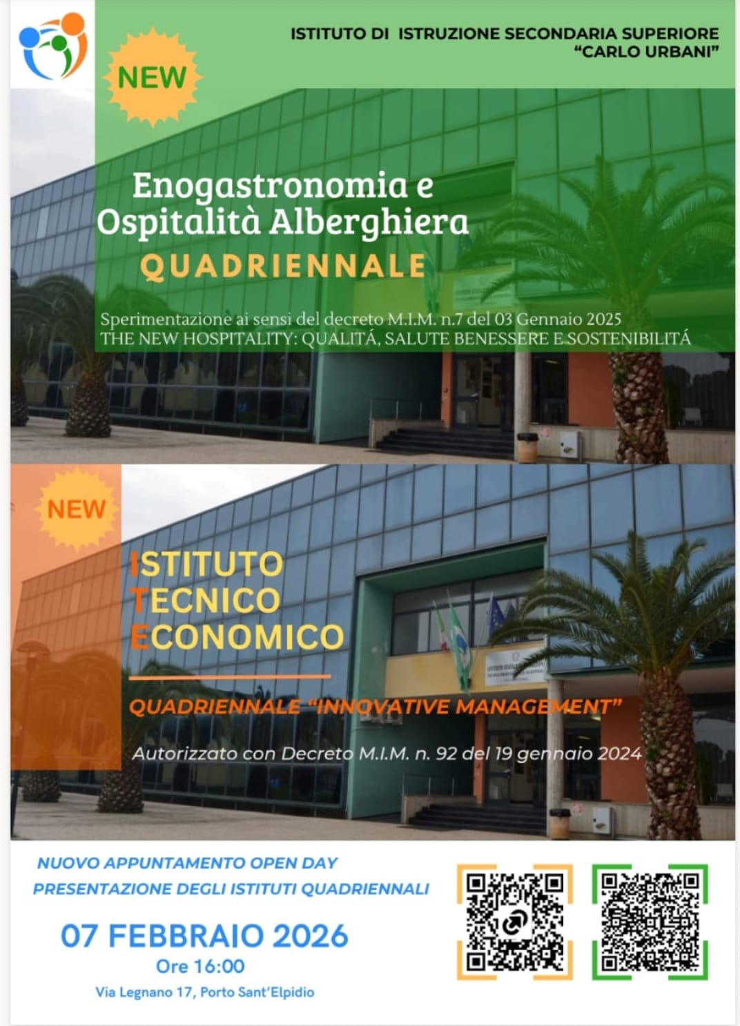 Nuovo appuntamento strategico dedicato all’orientamento degli alunni delle classi terze delle scuole secondarie di primo grado del territorio e alle loro famiglie sabato 7 febbraio, dalle ore 16:00 alle ore 18:00, presso la sede centrale dell’Istituto “C. Urbani” di Porto Sant’Elpidio.