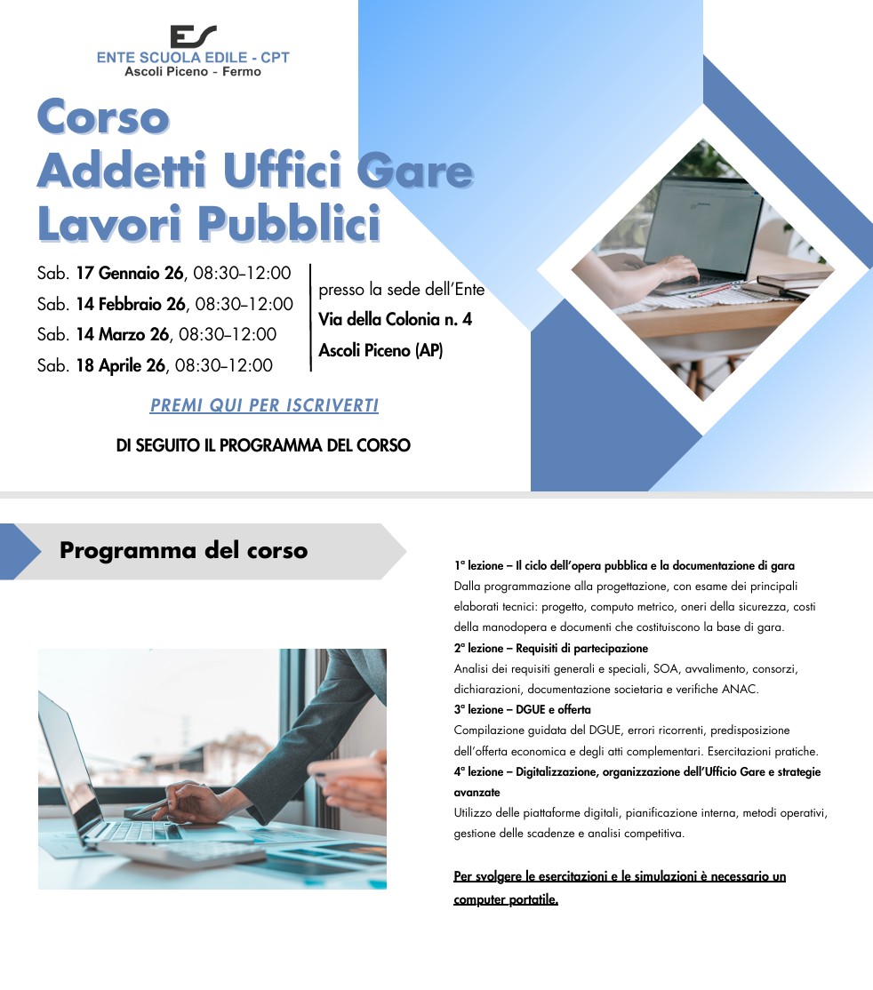 L’Ente Scuola Edile delle Province di Ascoli Piceno e Fermo, punto di riferimento storico per la formazione tecnica e professionale nel settore delle costruzioni, organizza presso la propria sede di Via della Colonia ad Ascoli Piceno un percorso formativo dedicato agli Addetti Uffici Gare per i Lavori Pubblici. Il corso si svolgerà in quattro appuntamenti: sabato 17 gennaio, sabato 14 febbraio, sabato 14 marzo e sabato 18 aprile sempre dalle 8,30 alle 12, per una iniziativa pensata per rispondere alle esigenze sempre più complesse delle imprese che operano nei cantieri e partecipano alle procedure di gara, in un contesto normativo in continua evoluzione e fortemente digitalizzato.