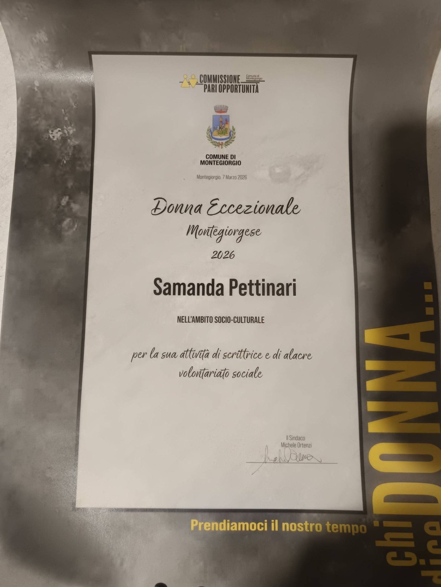 Nell’ambito dell’iniziativa “Chi dice donna…”, promossa dalla commissione Pari Opportunità del Comune di Montegiorgio in occasione della Festa Internazionale della Donna 2026, la presidente è stata insignita del riconoscimento di “Donna eccezionale montegiorgese 2026” nell’ambito socio-culturale, per la sua attività di scrittrice e per il suo instancabile impegno nel volontariato sociale.